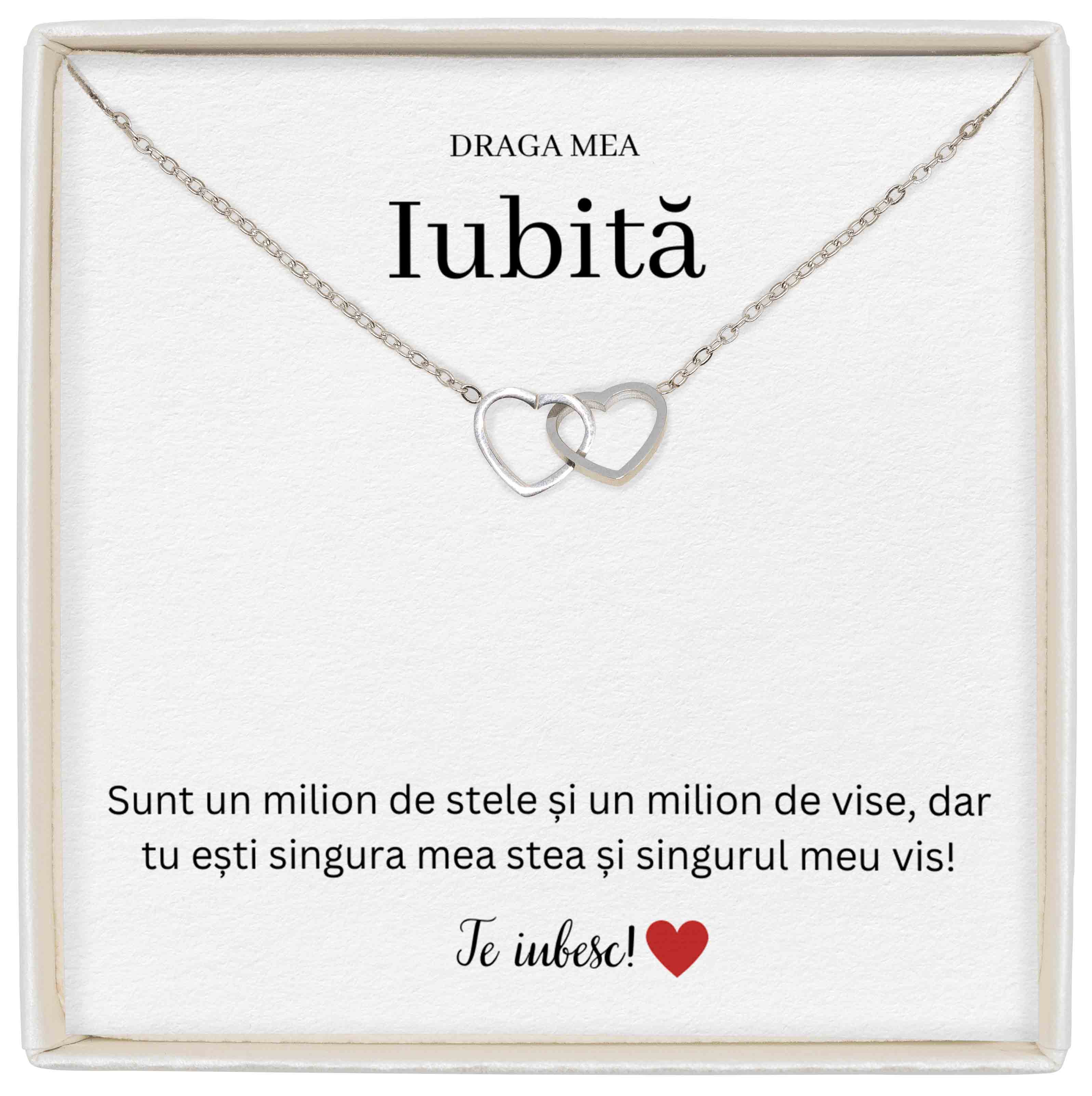 Arată-i cât de mult o iubești cu un colier care spune totul dintr-o privire. Acest design delicat și romantic este simbolul perfect al iubirii voastre – sinceră, profundă și de neînlocuit. Livrat într-o cutie elegantă de cadou și însoțit de un mesaj emoționant pentru iubita ta, colierul este o bijuterie cu suflet, ideală pentru aniversare, Valentine’s Day sau orice moment în care vrei să o surprinzi cu un gest special. Un cadou pentru iubită care lasă amintiri.
